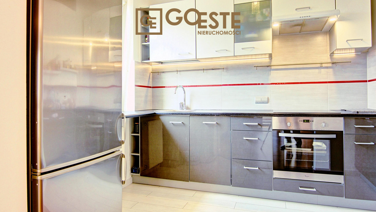 Głównym punktem mieszkania jest przestronny salon z otwartą kuchnią w pełni wyposażoną z sprzęt AGD (płyta grzewcza, zmywarka, lodówka, okap, piekarnik).