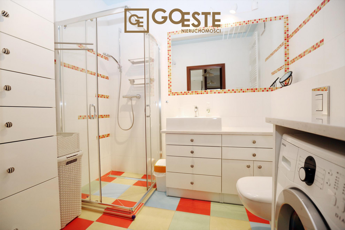 W łazience jest okazały prysznic, pralka oraz szafki co stanowi dodatkowe miejsce na przechowywanie.